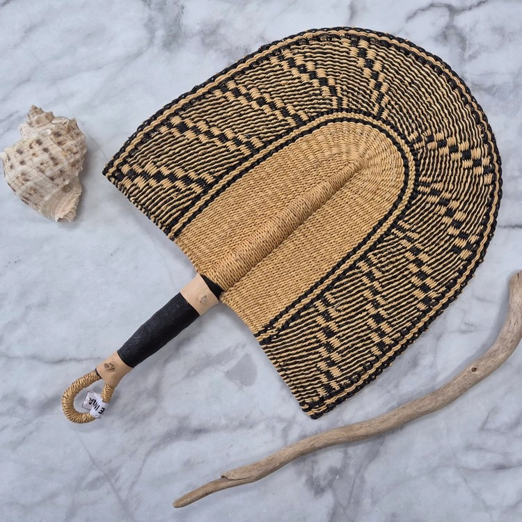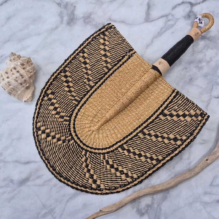 아프리카 가나의 뜨거운 태양 아래에서 손으로 짜여진 이 부채가